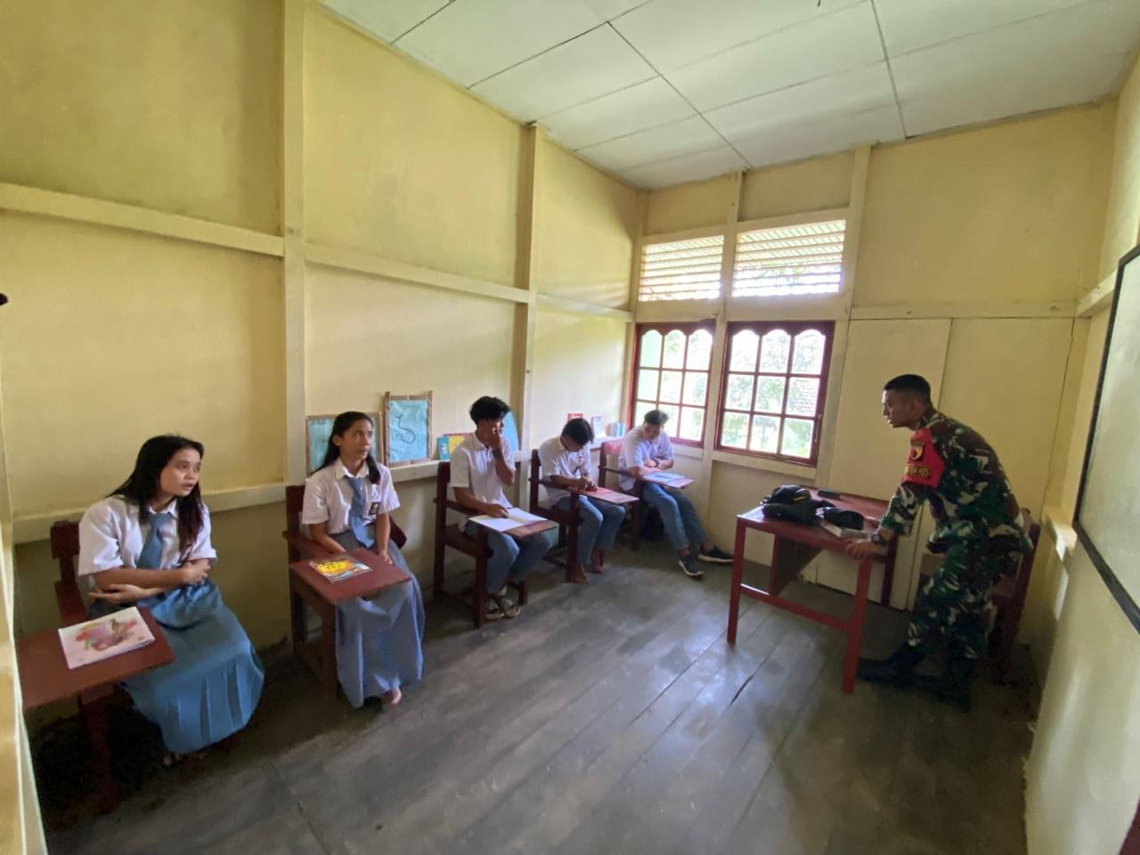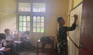PORTALINDO.CO.ID | Sintang – Satgas Pamtas RI-Malaysia Yonzipur 5/ABW menjadi tenaga pendidik di sekolah SMK Kesehatan “Dharma Husada” yang berada di wilayah perbatasan yang kekurangan tenaga pengajar (Guru), seperti yang dilakukan oleh Danton Kes Satgas Pamtas Letda Ckm Aditya di Desa Snaning, Kecamatan Ketungau Hulu, Kabupaten Sintang, Kalimantan Barat. Senin (5/8/2024).