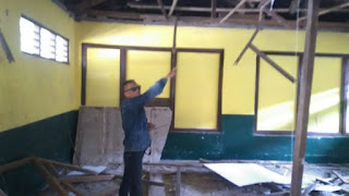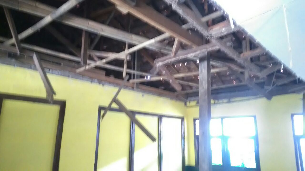 Kondisi ruang kegiatan belajar mengajar SD Mangunjaya 04 ambruk dibagian plafon dan kaso, balok penompak bagian atas pun ambruk.