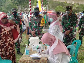 Penyuntikan Vaksin tersebut dilakukan pada saat Kunjungan Pengawasan dan Evaluasi (Wasev) TMMD Ke 111 Kodim 1010/Tapin di Lapangan Bola Desa Suato Lama, Kecamatan Salam Babaris. Rabu, (30/6/2021) kemarin.