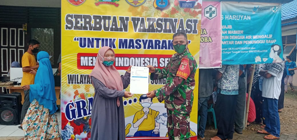 PORTALINDO.CO.ID, BARABAI – Sebagai upaya mensukseskan pelaksanaan vaksinasi nasional, Koramil 1002-3/Haruyan Kodim 1002/HST bekerjasama dengan Puskesmas Barikin dan Puskesmas Haruyan melaksanakan kegiatan serbuan vaksinasi covid-19 gratis untuk masyarakat umum.Kamis (08/07)