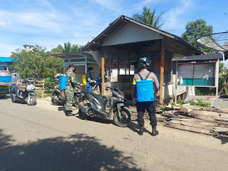 Salah satu kegiatan Babinsa jajaran Kodim 1002/Hulu Sungai Tengah dalam pencegahan penyebaran Covid-19 yaitu dengan melakukan penyemprotan Disinfektan.