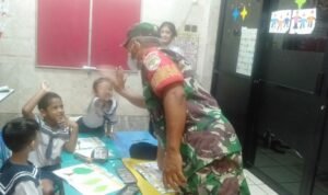 Babinsa Serma Wakdinator Anggota Koramil 01/Tamansari Kodim 0503/JB dalam komsosnya menyempatkan diri memberikan penyuluhan dan bimbingan kepada anak TK Sangkala Jalan Mangga Dua III, Kel. Pinangsia, Kec. Tamansari, Jakarta Barat. Senin (5/12/22).