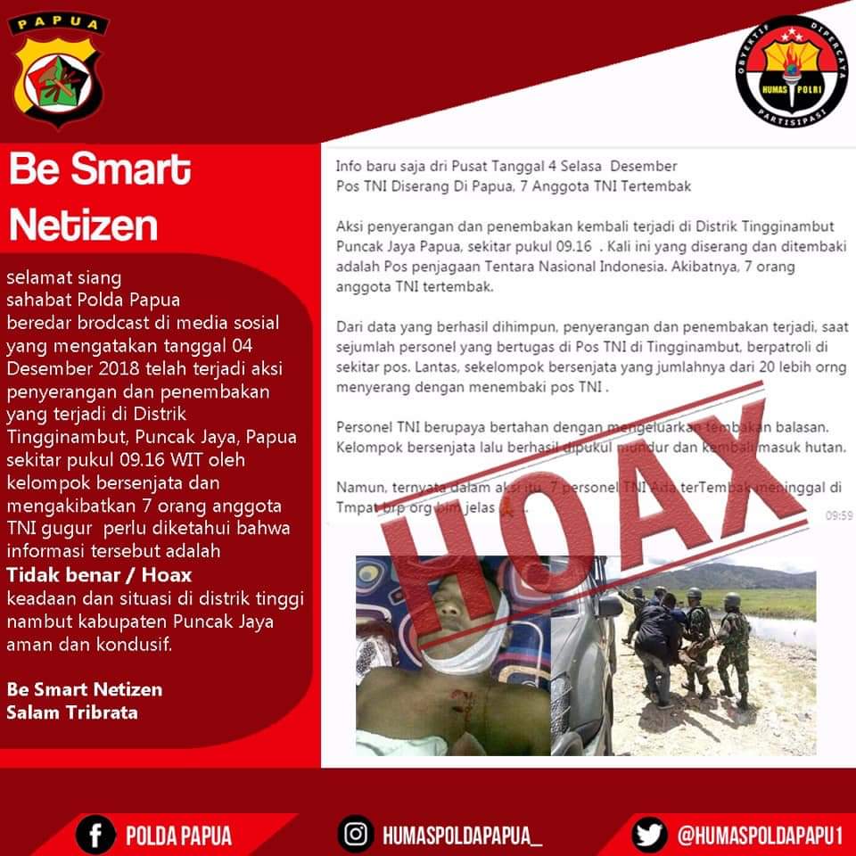 Kapolres Puncak Jaya AKBP Ary Purwanto, S.IK saat dikonfirmasi mengenai kejadian tersebut mengatakan ” Berita penyerangan dan penembakan oleh Kelompok Kriminal Separatis Bersenjata (KKSB) yang terjadi di Pos penjagaan TNI di Distrik Tingginambut dimana dalam kejadian tersebut diberitakan 7 anggota TNI meninggal dunia ternyata tidak benar atau berita tersebut adalah berita HOAX”.