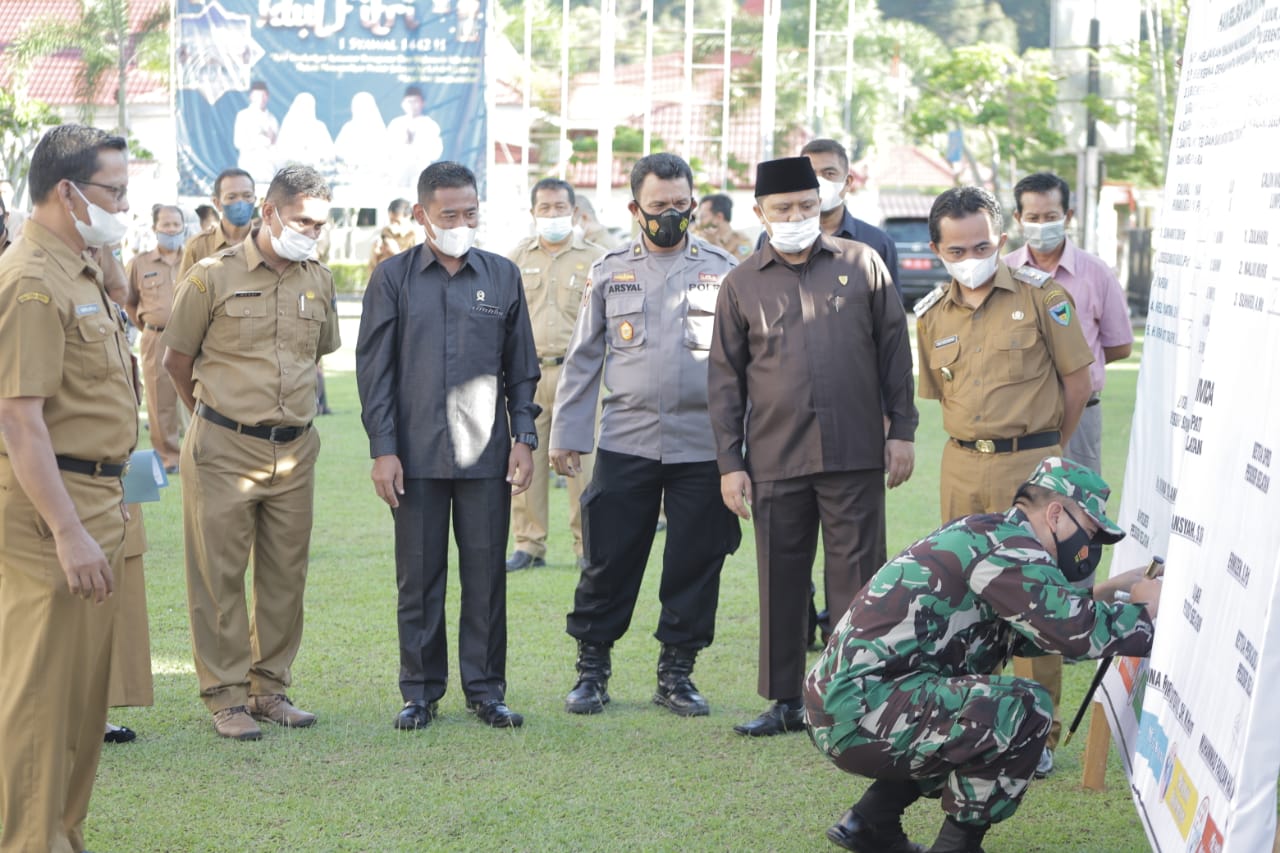 Portalindo.co.id, Pessel – Dalam rangka mensukseskan  pelaksanaan pemilihan wali nagari serentak di kabupaten pesisir selatan Tahun 2021, komandan Kodim 0311/Pessel Letkol Inf.Gamma Arthadilla Sakti Hadiri penandatangan deklarasi damai pemilihan wali nagari serentak,bertempat di Halaman Kantor Bupati Pesisir Selatan,di nagari Painan Kec.IV Jurai.Senin 7/6/2021.