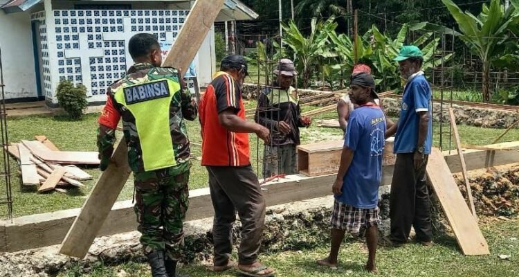 Babinsa Posramil Biak Timur Karya Bakti Bantu Warga Bangun Pagar Gereja