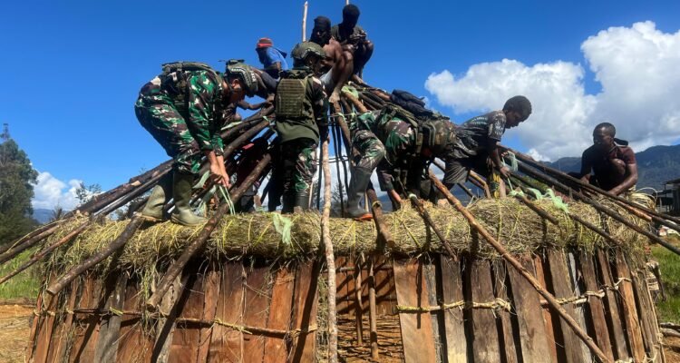 Satgas Habema Bersama Warga Gotong Royong Bangun Honai di Yenggernok
