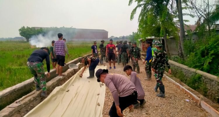 Satgas TMMD dan Warga Pasang Plastik Cor Perkuat Pembuatan Jalan