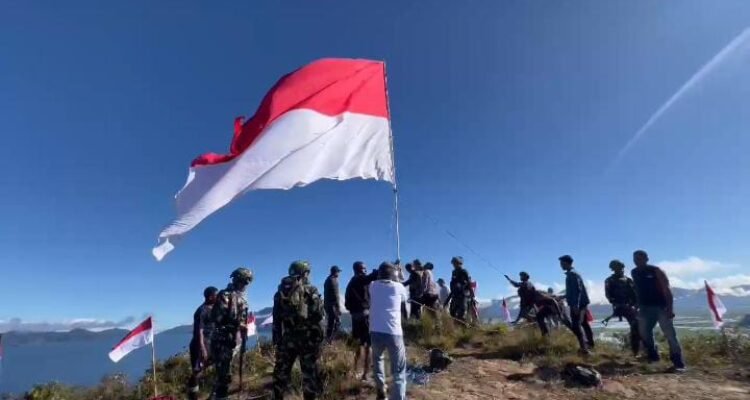 Satgas TNI Kibarkan Bendera Merah Putih Bersama Masyarakat Di Puncak Tertinggi Enarotali Bukit Bubaero