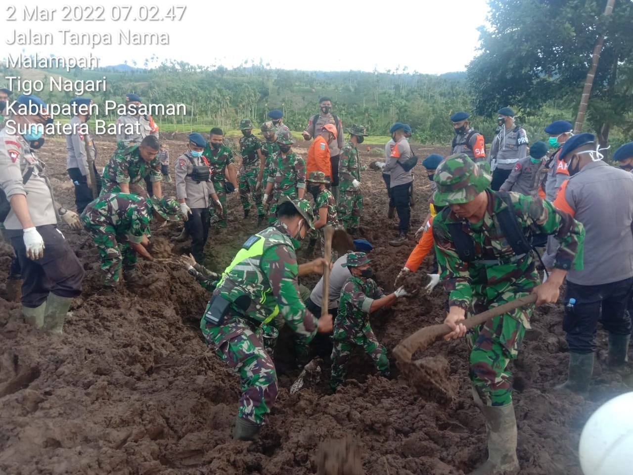 PORTALINDO.O.ID, Pasaman – Tim Siaga bencana dari Yonif 131/Brs berhasil temukan 1 mayat lagi sehinga seluruhnya menjadi 13 korban jiwa dampak bencana Gempa bumi di Jorong Siparayo Nagari Malampah Kec. Tigo Nagari Pasaman. Rabu (2/3/22)