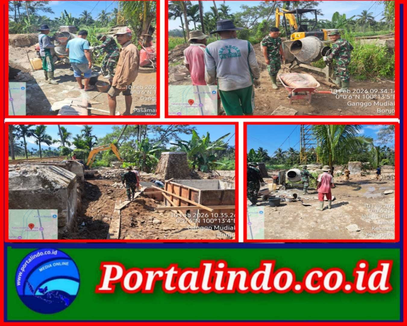 PASAMAN – TNI Angkatan Darat melalui Kodim 0305/Pasaman terus memacu pembangunan Jembatan Gantung Equator di Jorong Kampung Alai, Nagari Ganggo Mudik, Kecamatan Bonjol, Kabupaten Pasaman, Sumatera Barat, Selasa (10/2/2026). Pembangunan infrastruktur ini menjadi wujud nyata kemanunggalan TNI AD dengan rakyat dalam mendukung percepatan pembangunan wilayah pedesaan.