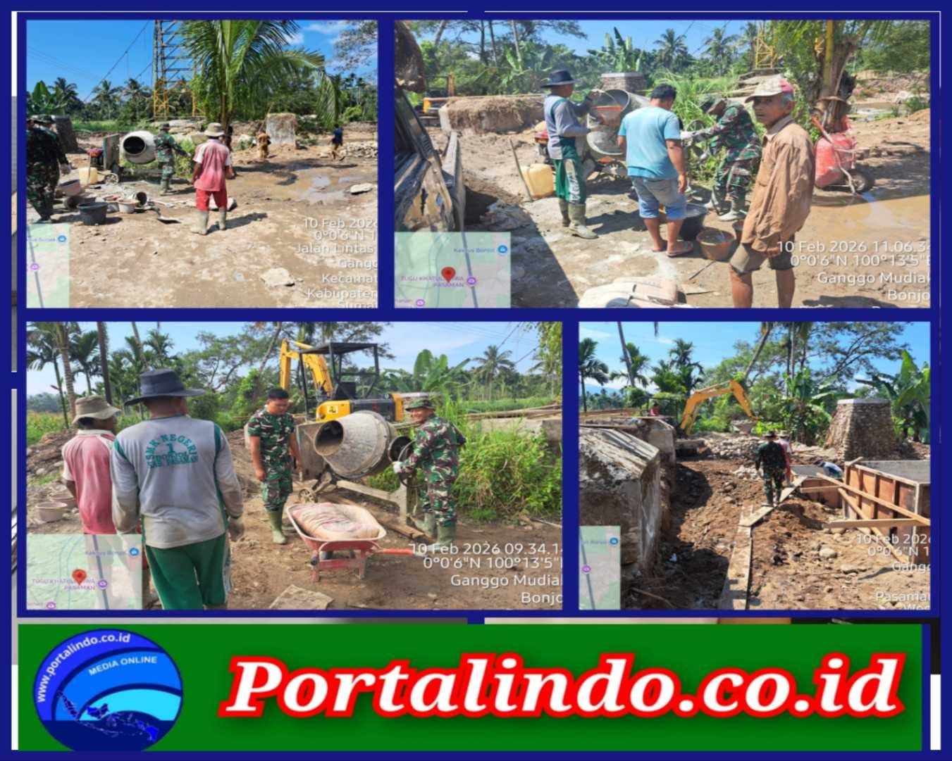 PASAMAN , tniad.mil.id — TNI, pemerintah daerah, dan masyarakat memperlihatkan semangat kebersamaan dalam pembangunan Jembatan Gantung Equator yang berlokasi di Jorong Kampung Alai, Nagari Ganggo Mudik, Kecamatan Bonjol, Kabupaten Pasaman, wilayah teritorial Kodim 0305/Pasaman, Selasa (10/2/2026).