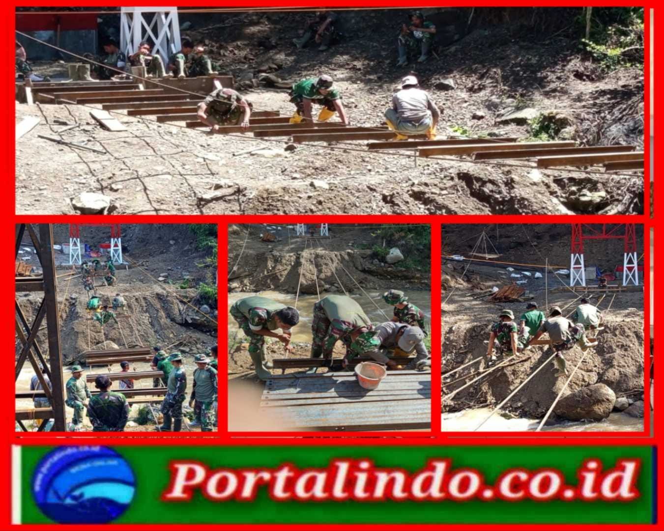 ACEH TENGAH – Prajurit TNI dari Kodim 0106/Aceh Tengah bersama personel Yon TP 854/DK terus menggenjot pembangunan jembatan gantung di Desa Burni Bius, Kecamatan Silih Nara, Kabupaten Aceh Tengah. Hingga Kamis (21/2/2026) pukul 16.30 WIB, progres pembangunan telah mencapai 51 persen.